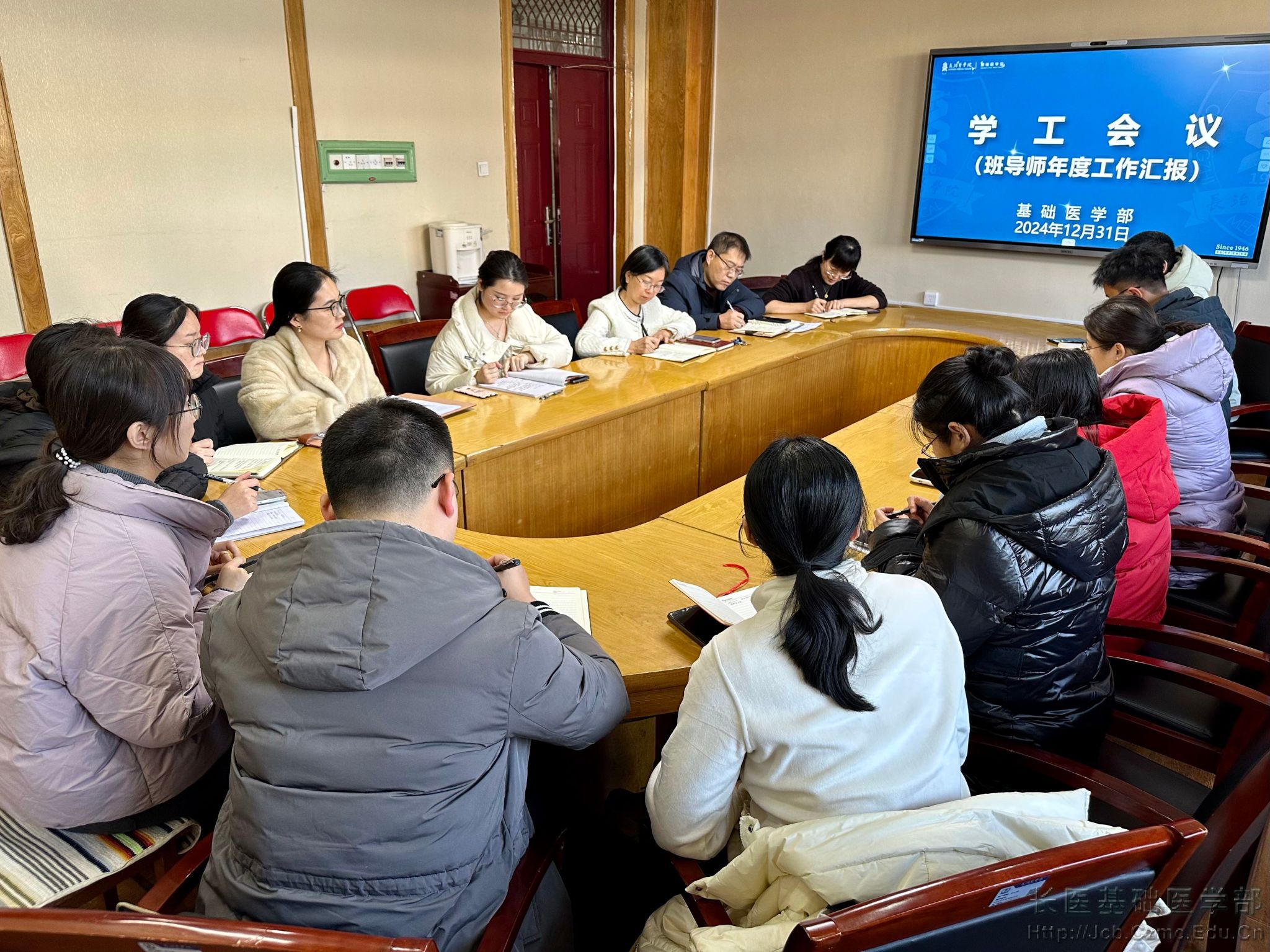 为总结经验,共绘员工培养新蓝图,12 月 31日下午,基础医学部召开班导师年度工作汇报会,医学实验技术专业各年级班导师齐聚一堂进行年度经验总结交流,副书记原慧刚、副主任原丽及全体辅导员参会。党总支书记李萍主持会议。