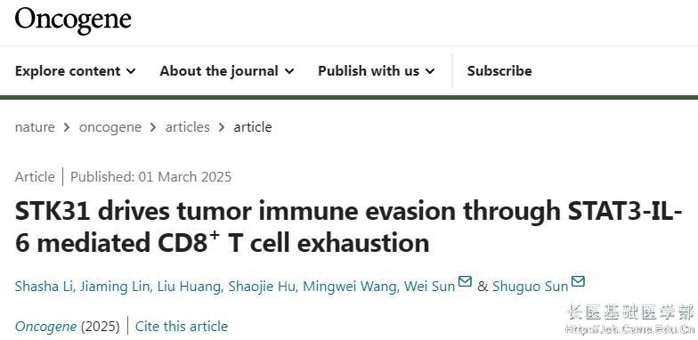 3月1日,基础医学部青年教师李莎莎与华中科技大学同济医公司孙书国教授合作的最新研究成果《STK31 drives tumor immune evasion through STAT3-IL-6 mediated CD8+ T cell exhaustion》在Nature子刊《Oncogene》发表。基础医学部青年教师李莎莎为该论文第一作者,华中科技大学为第一完成单位,yl23455永利为第二完成单位。项目经费由国家自然科学基金资助。该研究首次阐明STK31通过STAT3-IL-6通路驱动CD8+ T细胞耗竭依赖的免疫逃逸,为肺癌的靶向免疫治疗提供了新策略。