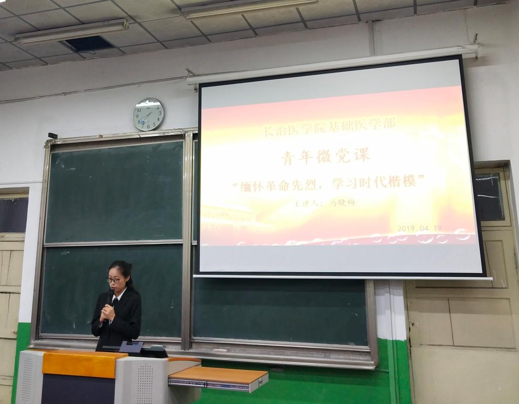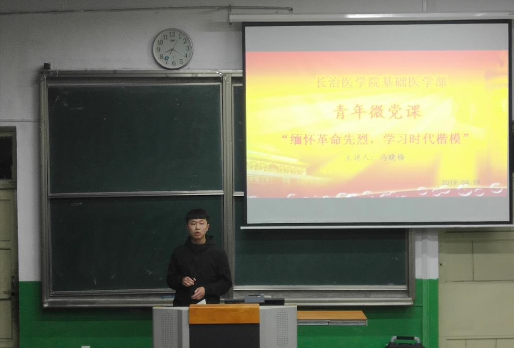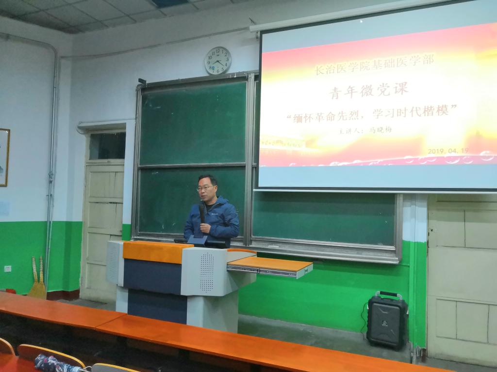 为弘扬民族精神,传承红色基因,坚定理想信念,基础医学部党总支于4月19日晚在开展了“微电影党课专题教育活动”第三期“缅怀革命先烈,学习时代楷模”主题活动。基础医学部分团委书记李明老师,全体在校预备党员、入党积极分子以及17、18级全体同学在北区五教室观看纪念英雄先烈的影片。本次活动由基础医学部党总支主办,员工会承办,主题活动由员工会主席梁梦蕊主持。